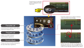 This new style of 3D menu features three genres of menu rings—Favourite, Frequent, and Recent Album. Call up the contents you want or destinations from the menu rings floating in a graphical 3D space. |