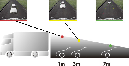 On-screen markers are displayed at 1, 3, 5 and 7 metres for reference as rear proximity verification (CJ981E, CJ723E, CJ763E). The markers are designed in 7 patterns that correspond to the height at which the camera is installed on the vehicle. There are 7 screen marker patterns ranging from a height of 2 to approx. 3.5 metres (in steps of 25 cm). Furthermore, vertical and horizontal fine adjustment is possible.
